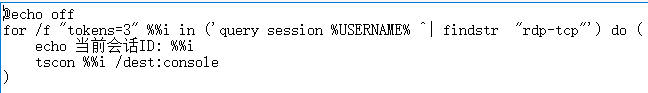 写一个批处理脚本,脚本的作用是断开 RDP 前,执行一条命令把会话转移到控制台,让它保持Active而非Disconnecte。