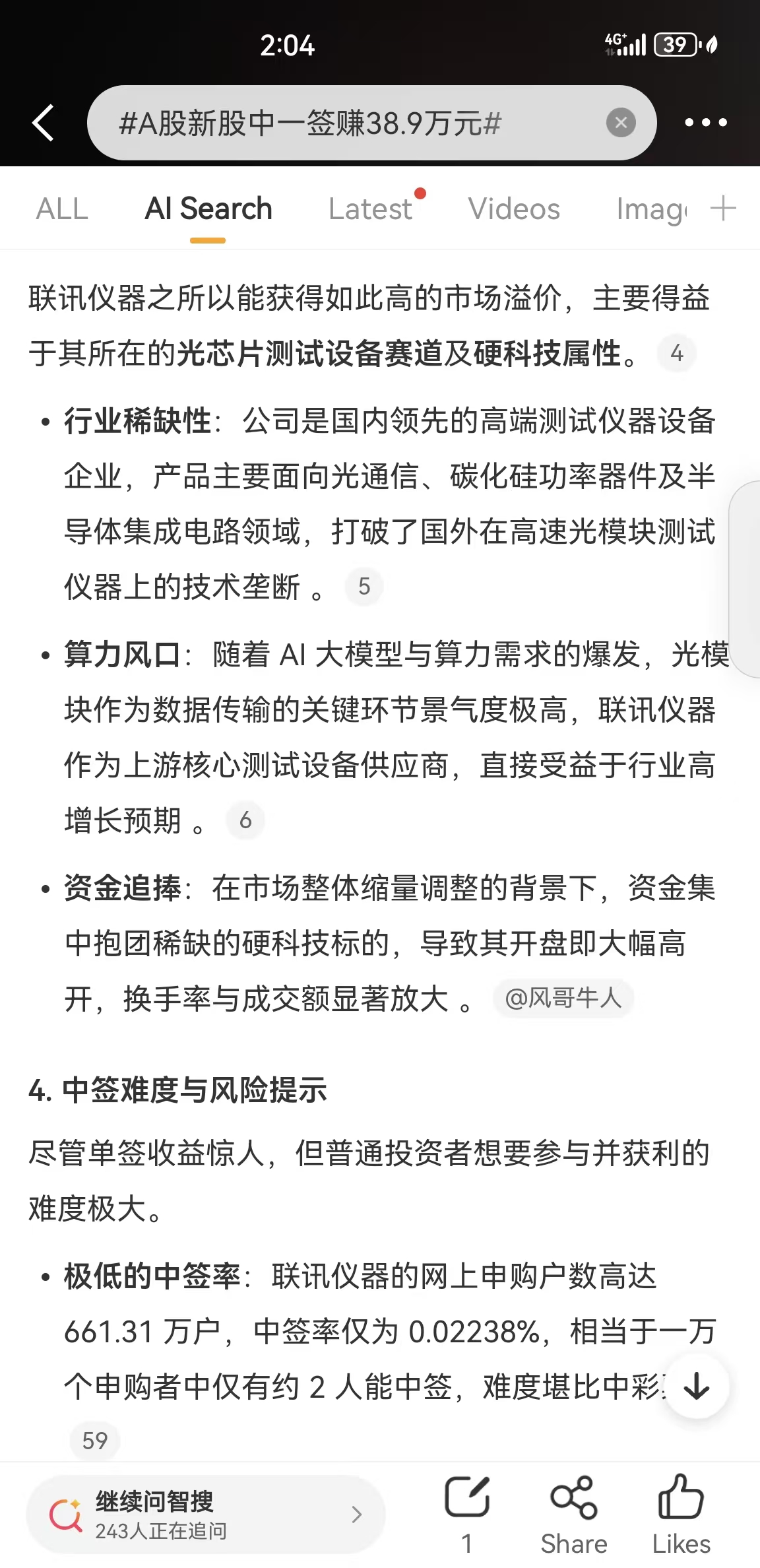 对比鲜明的是,上周中签了新股联讯仪器,赚了近40万,消息分享给全家,没有人开心,什么庆祝也没有,就是表示知道了,没有人特别开心,就是寻常的一天,哪怕这是泼天的运气,一万人才有两个幸运儿中签。全家知道消息后,都比较平静,没有明显的反应。