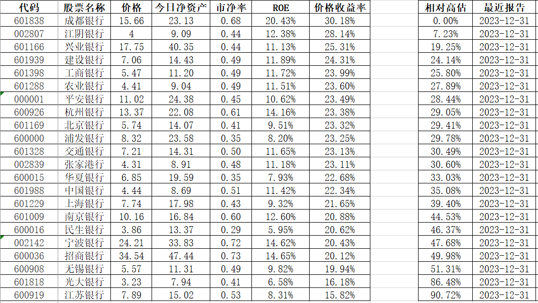 601288 农业银行 4.44 9.04 0.49 11.51% 23.44% 31.20% 2023-12-31