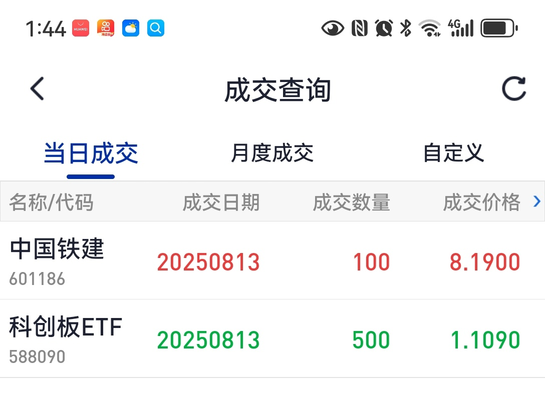 2月23日买入中国广核100股 成交价2.73元 4月21日 卖出中国铁建1300股 成交价11.51元 4月26日买入中国铁建1300股 成交价10.92元 买入中国广核200股 成交价2.99元 5月10日买入科创板etf100股成交价1.069元 8月2日 买入中国广核100股成交价3.13元 买入科创板etf100股成交价1.004元
