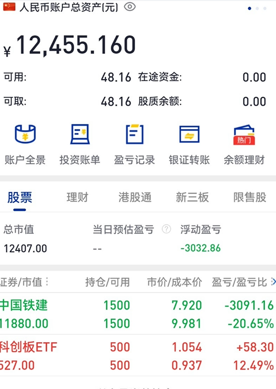 7月24日:卖出中国广核100股成交价5.09元买入中国铁建100股成交价8.14元买入科创板ETF200股成交价0.747元
